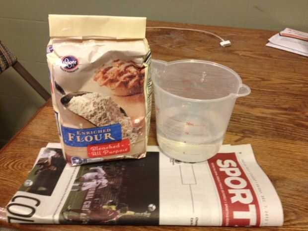 Materiales incluyen 8 onzas de harina y 8 onzas de agua por alumno, varios periódicos que los estudiantes se ralle en tiras grandes y varios materiales de cartón como cajas de zapatos, toalla de papel o tubos de papel higiénico u otros materiales como globos y popotes.