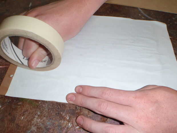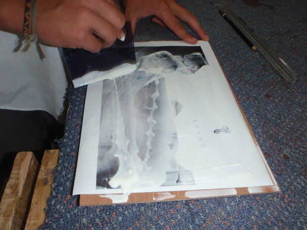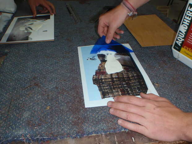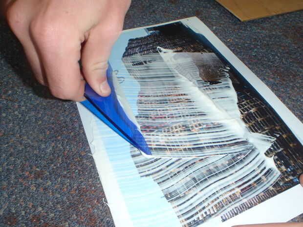 A continuación paso el papel sobre la madera y frote el papel para tener la cola bien pegada a la madera contrachapada. Puede ayudar el utilizar un rodillo o un rodillo de la cinta como un rodillo, si tienes demasiado pegamento puede ser rodado y exprimido por el lado de la impresión. Lo principal a recordar es que cada parte del trabajo debe ser bien pegado abajo.
