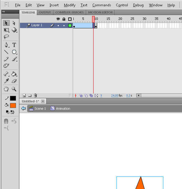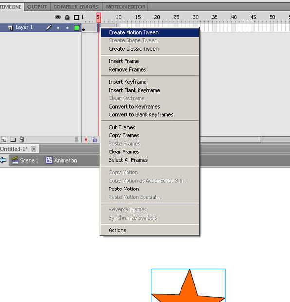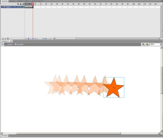 El proceso anterior lleva mucho tiempo. una manera mucho más rápida es utilizar una interpolación. Una interpolación es una secuencia de fotogramas que el programa crea para usted todo lo que necesitas hacer es decirle a fueron al inicio y al final, rellena el resto. Hacer una interpolación de movimiento es simple o bien haga clic derecho sobre una sección de marcos de tiempo y seleccione crea interpolación de movimiento (si aparece una ventana diciéndote que una interpolación de movimiento sólo se puede aplicar a los símbolos. Y le pregunta si desea activar su forma actual en un símbolo sólo haga clic en Aceptar). Ahora debe tener su posición de salida para la interpolación para hacer la posición final mantenga Ctrl un clic en el extremo de la sección azul de Marcos, entonces la posición del objeto en su posición final.