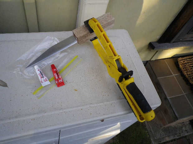 Aplicar el epoxi de 5 minutos en la parte posterior del collarín y en el interior de la empuñadura donde toca el tang.