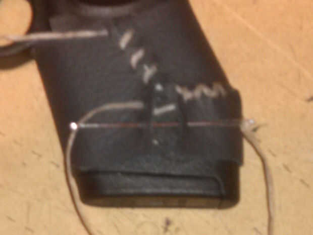 - Empiece en la parte superior con una puntada floja y deje aproximadamente una pulgada de hilo para atar a la final. Decidí ir directamente a través de la parte inferior y en diagonal en la parte superior. Puesto que el cordón va más a fondo, entonces detrás otra vez, que me dará "X" formas en la parte superior de la piel cuando estoy hecho.