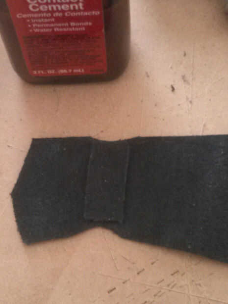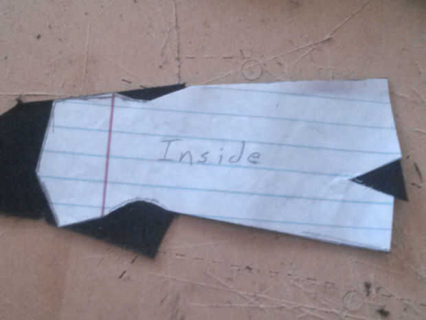 El mismo patrón fue utilizado, con algún ajuste adicional en el borde derecho (se muestra con marcas de lápiz) y a lo largo de la "V". Las fases de montaje son los mismos que los utilizados para la pistola, excepto la adición de dos espesores adicionales de cuero pegado en la empuñadura de cuero para que pusieron en el frente, agregando a granel y cambiando la forma de agarre. Desde el botón de activación del láser está situado bajo la empuñadura, se tuvo cuidado para asegurarse de que el mango no era demasiado apretado en ese lugar, y que el botón no era bajo suficiente presión para activar el láser. Para ayudar con eso, la costura se inició en medio de la empuñadura, no la parte superior, y así se encuentra el nudo final el dardo.
