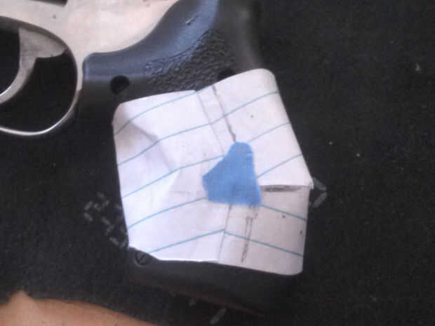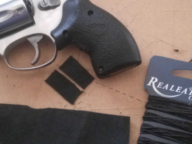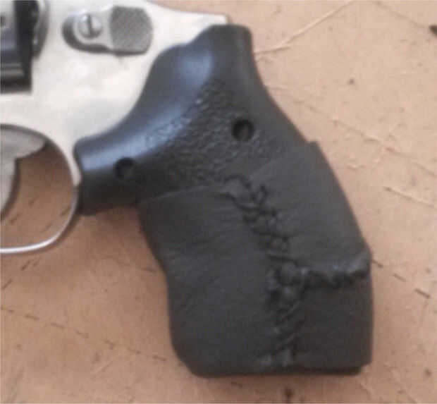 Se trata de un revólver.38 especial con un mango de láser de Crimson Trace. Era difícil de usar la mira láser, porque el botón de activación fue una situación incómoda y requiere un apretón apretado para activarlo. Al colocar la mano para usar el láser, el revólver tendía a punto alto. Es el apretón de cuero fue agregado en un exitoso intento de remediar estos problemas.