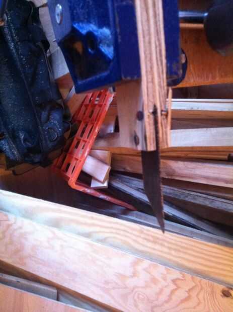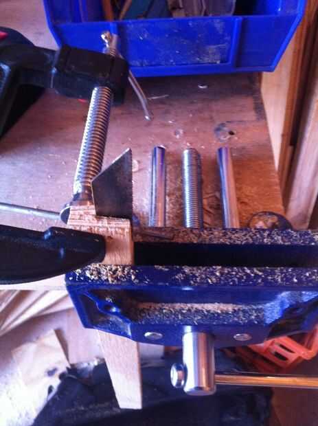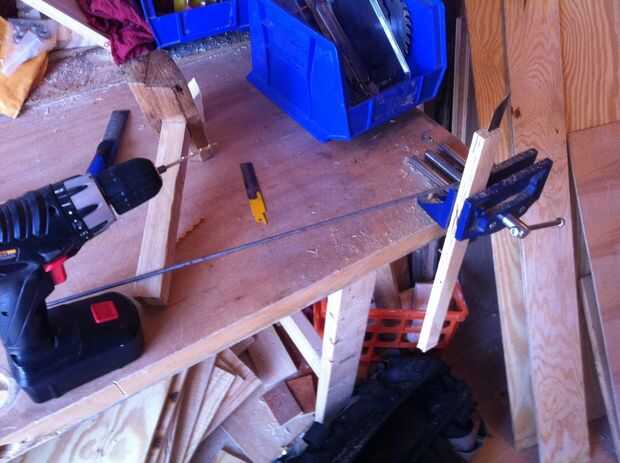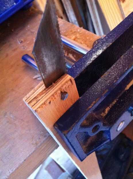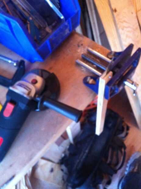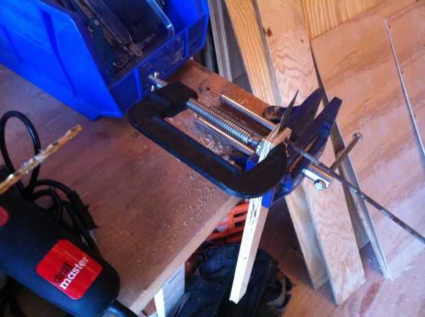Me sujeta la cuchilla en su lugar y perforaron agujeros en el cuerpo del cuchillo y la hoja. Utilicé un pedazo de la acción de la barra libre (1/8" Creo, pudo haber sido 3/16") que ha sentado en mi tienda para siempre (se puede saber por el moho jajaja). Latón o cobre hubiera sido mejor, pero no cualquiera tiene en la mano y quería minimalista. Utiliza la amoladora para cortar las patillas pero usted puede usar una sierra para metales. Dejé las patillas ligeramente orgulloso en cada lado para el siguiente paso.