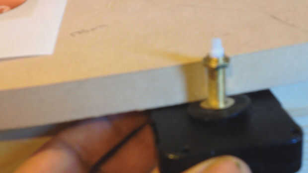Con pinzas, mida la circunferencia de su brazo de eje de mecanismo de reloj. Encontrar una paz taladro aproximadamente medio milímetro más grandes que el eje del mecanismo y perfore un agujero en el centro del tablero MDF