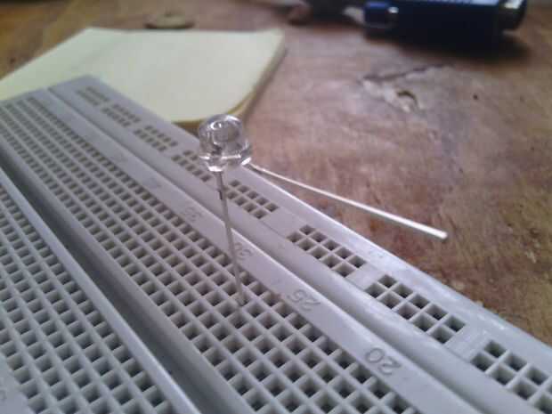 Doblar el terminal negativo (cátodo) de los LEDs y póngalos en el molde con los cátodos doblados tocan como se muestra en la foto. Para quien no lo sepa, el polo negativo es el más corto. Usted puede aprender más sobre LEDs en este enlace: http://www.arduino-hacks.com/connecting-an-led-to-arduino/