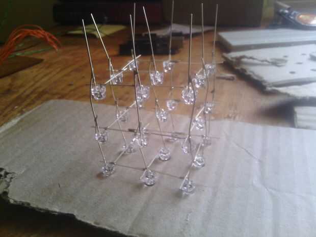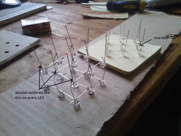 La soldadura de los cátodos en los puntos donde tocan para formar una capa del cubo del LED como se muestra en la foto. Repetir este proceso tres veces para que tengas 3 capas.