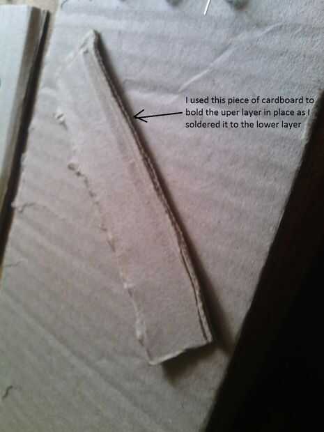Se unen las capas soldando los ánodos (terminales positivos). Para soldadura con eficacia los ánodos, utilizar una pinza de cocodrilo para mantener la capa superior en su lugar o utilizar un pedazo de cartón como lo hice.