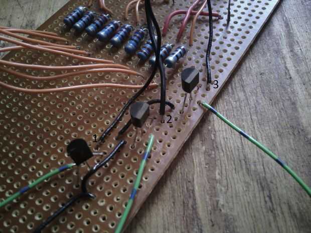4. Alambre del transistor. Los colectores de los transistores están conectados a las tres capas del cubo de LED. Los emisores están conectados con el conector de tierra de arduino. Las bases están soldadas a los cables que tienen las resistencias de ohm k 22 soldadas en ellas.