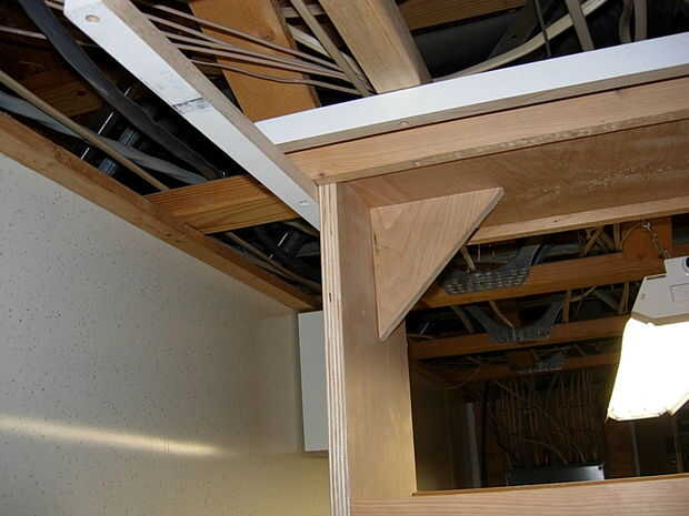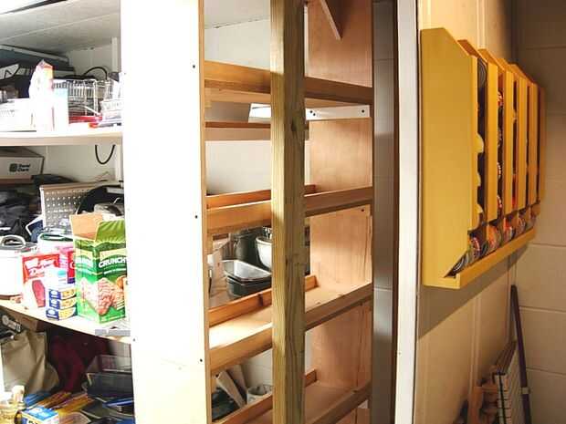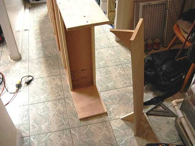 En la parte superior que los rieles guía extienden hacia fuera en el techo para que cuando se abre el estante no caerse. Un espaciador fue necesario para que las guías podrían pasar por debajo del frente y planchas de trama de nuevo. La altura del armario es lo suficientemente alta que no puede venir de los carriles como las ruedas permanecer en línea hasta que la parte inferior no puede deslizarse hacia los lados.