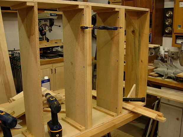 Soportes se cortan de cualquier desechos estaban alrededor. Luego se enroscan hacia el interior de la caja en cualquier intervalo que desee. Estoy usando las unidades para el almacenamiento de alimentos, por lo que 12" entre estantes funcionó muy bien. Es 6 estantes en cada caja.