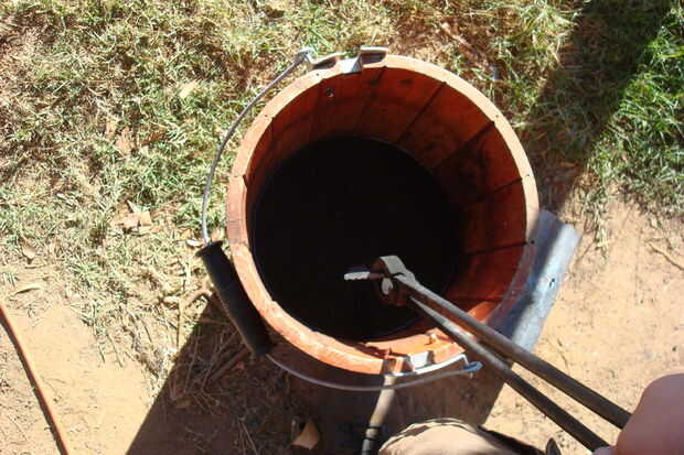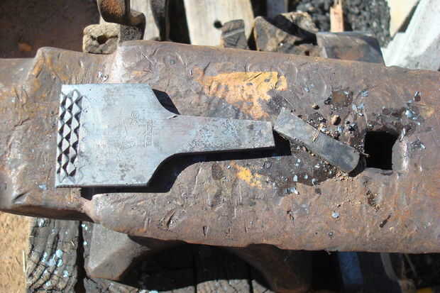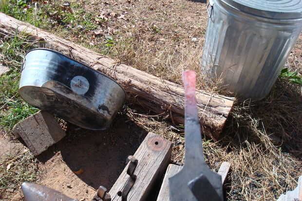 Parte del martillo (no eras todo ahora, usted sólo quiere utilizar un poco de él) de la probeta delgada (como, el espesor de la moneda de diez centavos), que utiliza el viejo tang de la escofina para esta parte. Luego, calentamos t a la temperatura crítica (encima no magnético) y saciar en su tina floja (utilizar el agua para esta prueba, mientras que algunas personas usan el aceite). Cuando se enfría, tomar la pieza de prueba, mantenga al borde del yunque le y golpee con el martillo. Si no se rompe, golpeó más duro. Eventualmente va romper o doblar. Es buena, es mala. Si se dobla entonces mezcle el conjunto raspador o utilizarlo para un proyecto de cuchillo no. Si se rompe (espero que con poca fuerza) luego proceder al siguiente paso.