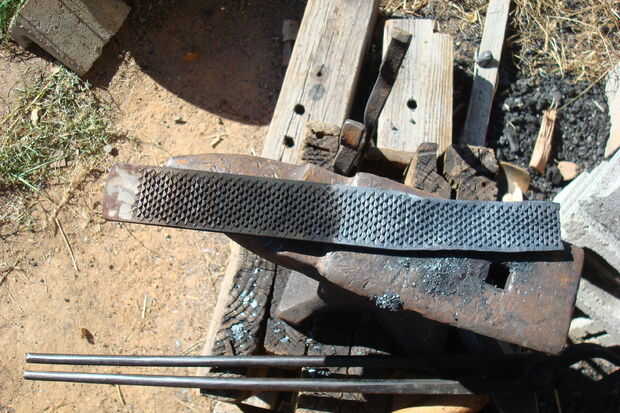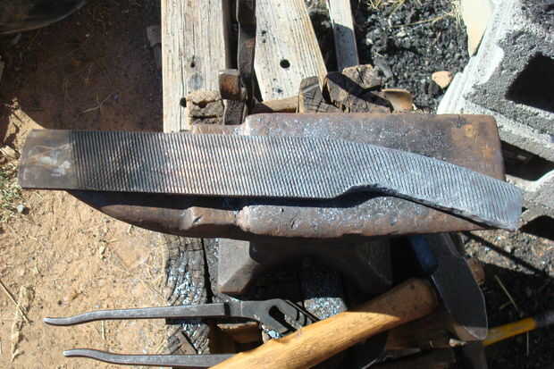 Siempre empiezo con el mango, que es cómo ruedo. puede empezar con la hoja si quieres, no me importa. Ahora, me decidí a hacer un completo tang mango, que me da menos forja que tengo que hacer, pero necesito forjar a la forma. En primer lugar, mientras que la escofina está fría, agarre en la mano y decidir qué vas a cambiar para hacerla sentir, marca donde desea comenzar la manija con un lápiz de esteatita (em en lowes en la sección de soldadura, o robar de la tienda del colegio donde tomar clases de soldadura). el resto es simple, calor caliente rojo y martillo hasta que esté bien. Uso de la Peña el martillo, y el borde de su yunque para el área del dedo. Te doy algunas fotos para guiarte a lo largo.