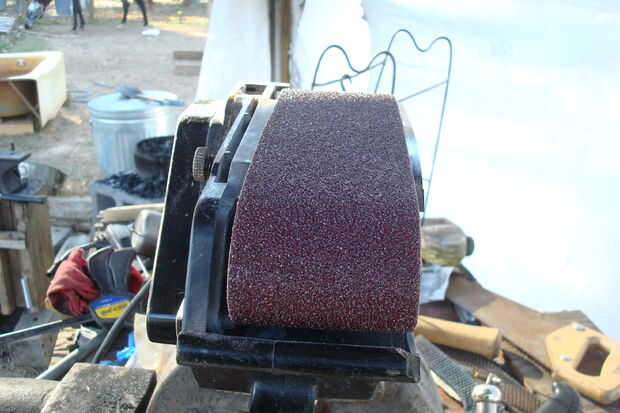 Entonces tomo mi lijadora de banda portátil de 3 "x 21" sujetada en un tornillo de banco. Y el uso de una correa áspera (I lik 36 grano) y limpiar todo el ángulo de pulido.