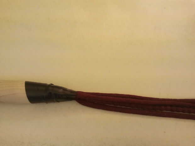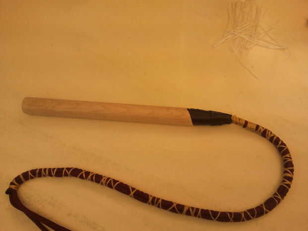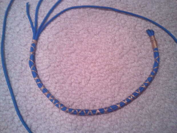 Para el látigo, corte 3 hilos, 1 x 63", 1 x 45", 1 x 27". Se unen a la ballcord sobresale el mango y el punto de unión a la manija de la cinta.