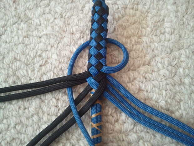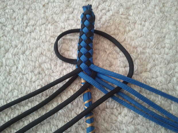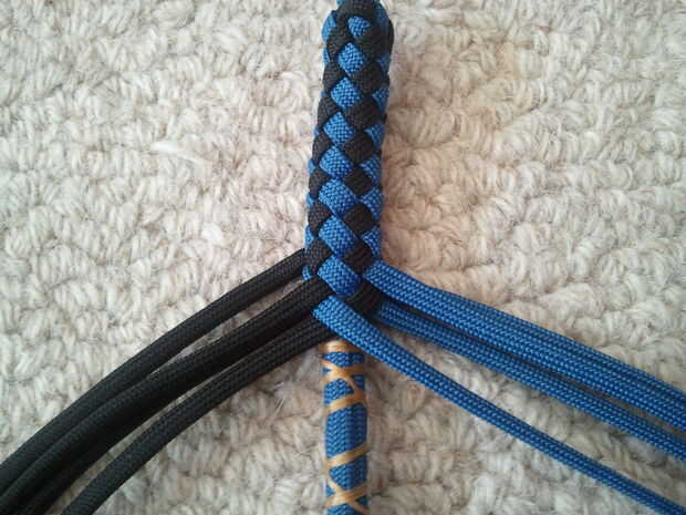 Atar el extremo con la trenza de diamante en un vicio por lo que se puede lograr el trenzado apretado. Tire con fuerza, después hacer la U2O2. Tensar, trenzar flojo. Es mucho más fácil y le dará un látigo mejor que intentar tensar después trenzado un filamento a través.
