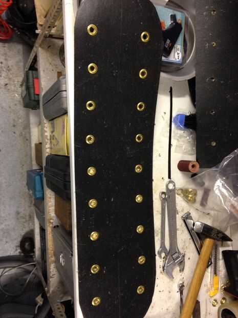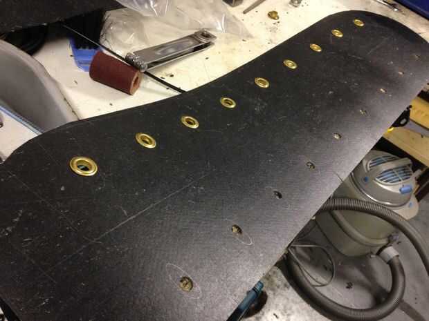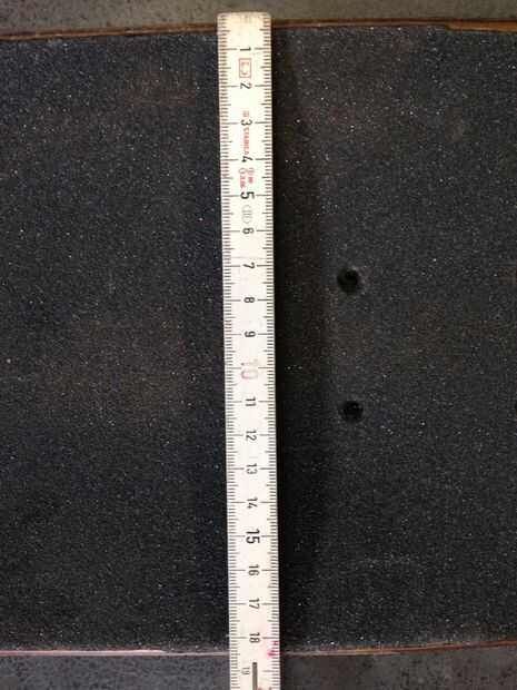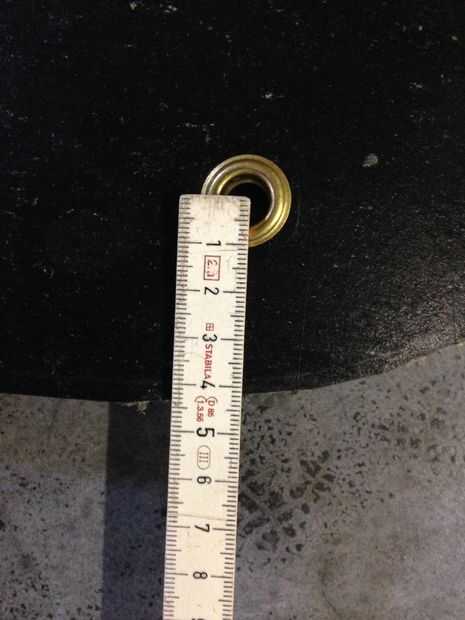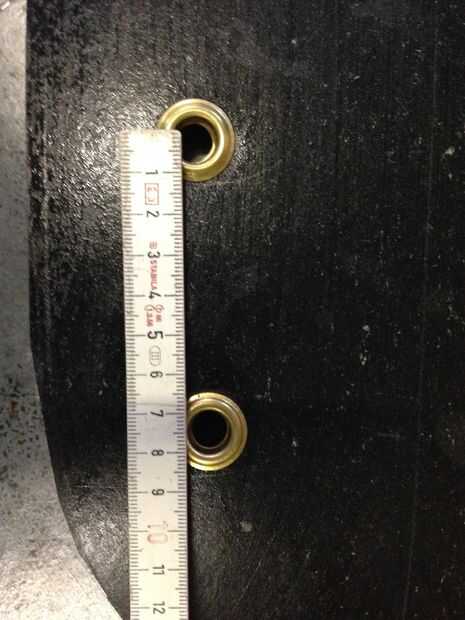• 9 hoyos en cada lado del taladro con una broca de 10mm. Estos agujeros deben de 4,5 cm de lado en un lado y 9,5 cm de la otra (esto se mide desde el punto más lejano del arco). El espacio entre cada agujero es de 7,5 cm. (imagen 9-12)