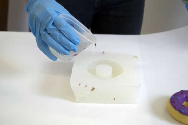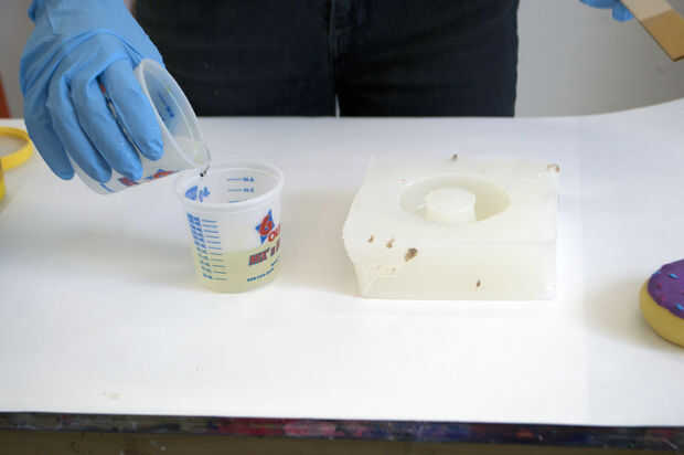 "Así que voy a les mezclar la y casi de inmediato los vierta en el molde. Y entonces verás que son ambos muy transparente pero ¡ nube y convertirse en blanco opaco. Y también se pone muy caliente cuando sucede porque es una reacción química loca.