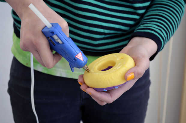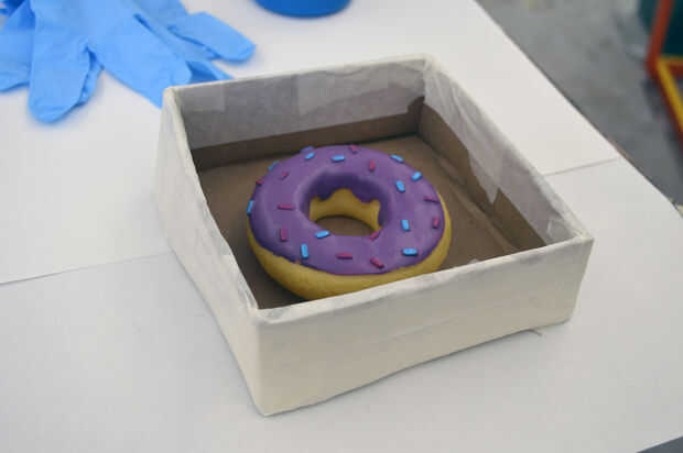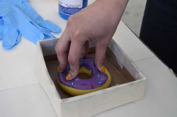 "Desde la parte inferior es plana como esta, lo que voy a hacer es pegamento hacia abajo sobre la superficie del molde sí mismo y llenar arriba. Y entonces [el fondo plano] se convertirá en la parte superior del molde.