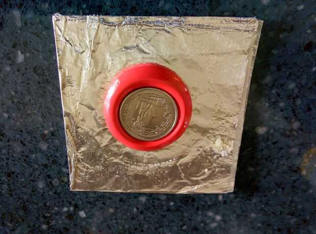 Colocar la moneda sobre el disco, a partir de un borde para desalentar las burbujas. Presione firmemente la moneda y cuidadosamente en el disco, manteniéndola plana.