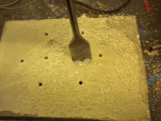 Taladre un agujero grande Vierta en la parte más fina del molde usando una broca. Me parece que un orificio de 1" es perfecto para una botella de agua de corte. Cortar botellas de agua hacen excelente embudos para silicona. Añadir los agujeros pequeños de purga en la parte superior y bordes para que aire puede escapar, y para que sepas cuando el molde está lleno. Para ello en los puntos finos de su molde.