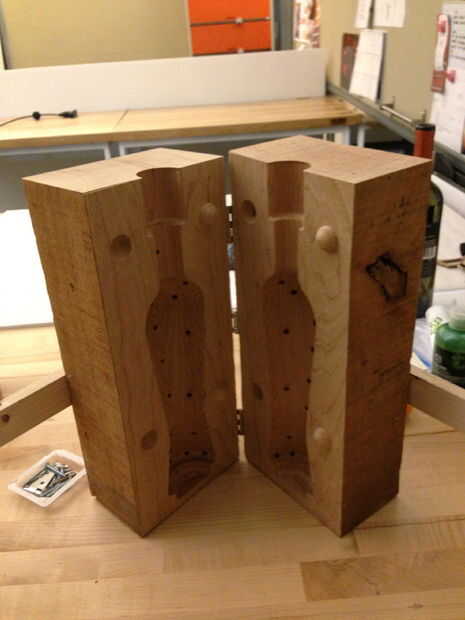 El molde se acaba con las bisagras y los mangos. Agujeros en el molde para permitir que el aire liberar a través de cuando el vidrio está fundido en el molde.