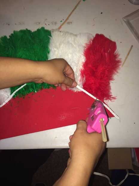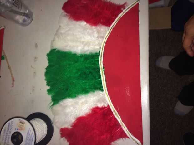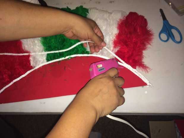 Escoje el frente y reverso del favor. El espuma debe quedar de reverso para dentro pegado ala frente. Se pega con silicona la lentejuela en pesando en una orilla dejando un pedacito para de vuelta y pege atrás. Siguiendo la linea de plumas para tapar las puntas.