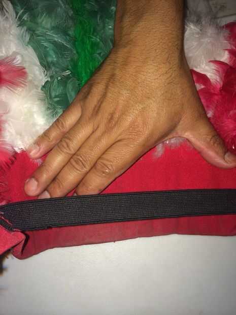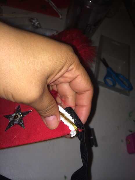 Se cose una orilla del elástico negro de 1" ancho x 12" largo. Asegurar y coser el otro lado.