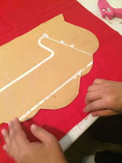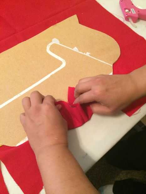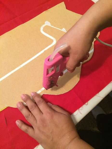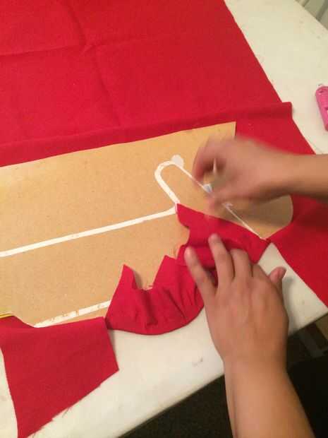 Empresa en el lado del cartón y pega con silicon el centro primero. Pedaso por Pedaso. Estirando la tela para que no tenga arrugas. Se curta el exceso con navaja