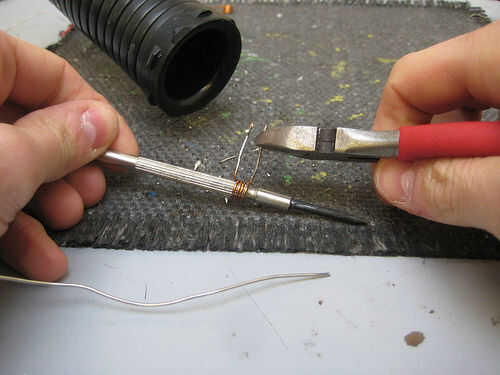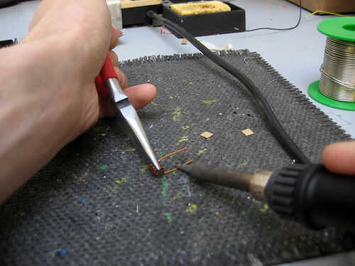 Utilice unos alicates de punta para agarrar la bobina mientras estañado - puede estar muy caliente. Calentar una pierna con el soldador durante unos segundos.