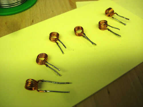 Su bobina completado debería parecerse a uno de ellos. y se puede insertar en un agujero de 1,5 mm en un PCB. Para Niftymitter, la frecuencia de transmisión del transmisor puede incrementarse mediante el aumento de la separación de las vueltas de la bobina. Esto puede lograrse usando la cabeza de un destornillador pequeño para manipular las lagunas.