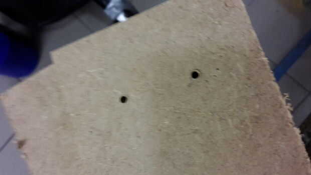 • Taladre los agujeros para los pernos de 3 ojo y las 2 ruedas en la primera tabla y lo mismo para el otro pero sin perforar para 2 ruedas. Asegúrese de que los pernos de ojo se separan uniformemente a través del tablero (véase el cuadro arriba)