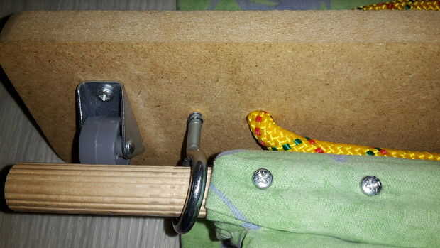 • Después de asegurar los pernos del ojo y las 2 ruedas en la primera tabla y los pernos de ojo en el segundo es tiempo para fijar la cuerda.