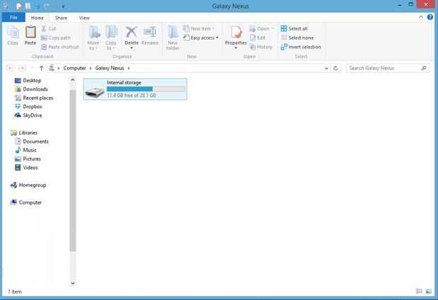 Cuando se conecta el teléfono a la computadora, se instalará automáticamente controladores. Una vez que termina, usted tendrá que navegar a la donde pondremos el archivo MP3. Ir a "Mi PC" y haga clic en "Galaxy Nexus". Se debe llegar a un punto como se muestra arriba. Haga clic en "Almacenamiento interno"