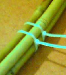 Ahora corte algunas longitudes de 30mm de tubo de desagüe para actuar como bandas alrededor de las cañas; hará unos 4 o 5. Estos se desliza sobre los extremos delgados y empujados hasta firmemente el extremo grueso, les espaciado hacia fuera por 15 cm. Puede que toque la banda para moverse a lo largo. Si la banda está floja, luego quitártelo y usar una abrazadera en su lugar. Acabar con las ataduras de cables (no demasiado apretadas en esta etapa) cada 15cm a lo largo del poste hacia el extremo fino.