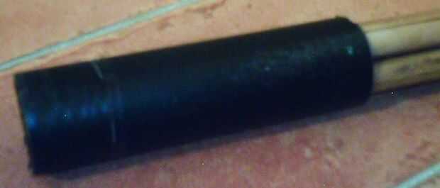 A continuación usted jam los extremos gruesos de sus cañas de bambú en el tubo. Puede sobresalir si lo desea, pero mía no. Necesitaba mi martillo en el tubo muy difícil, pero esto es mejor ya que necesitan ser agarrado firmemente juntos.