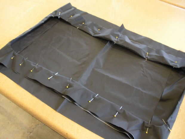 Ahora, del tirón el refuerzo alrededor para tener su muestra de costura acabado agradable.  Si usa un nylon, es posible que (como yo lo hice) que su tela no va a quedar plana.  Si este es el caso, una vez que tengas tus asas volteadas, simplemente prender otra vez y ejecutar otra costura alrededor del borde para ayudar a mantenerlo plano.