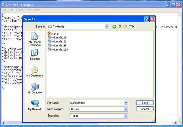 Guardar como manifest.json con guardado como tipo: Todos los archivos y codificación: UTF-8