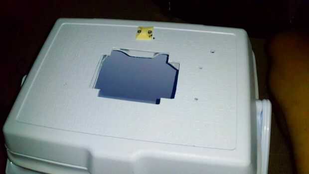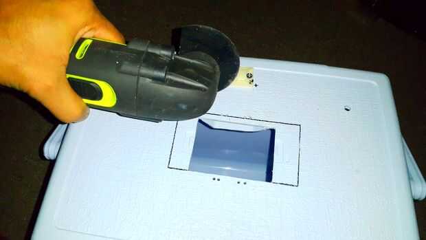 Marcando la forma del disipador de calor, corte una abertura en la tapa de la nevera. Usé un cuchillo para eliminar las rebabas de los bordes y luego mi aspiradora para quitar todo el lío.