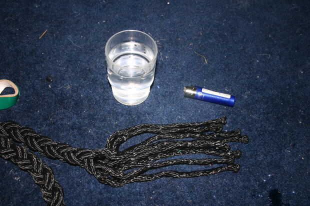 Trabajando rápidamente, cauterizarlo al final de cada hilo con el encendedor. Tenga cuidado para sostener el extremo sobre el vaso de agua mientras que hacerlo como si el plástico gotea lo puede ser bastante doloroso. También asegúrese de mantener los dedos lo más atrás desde el extremo de la cadena como sea posible.