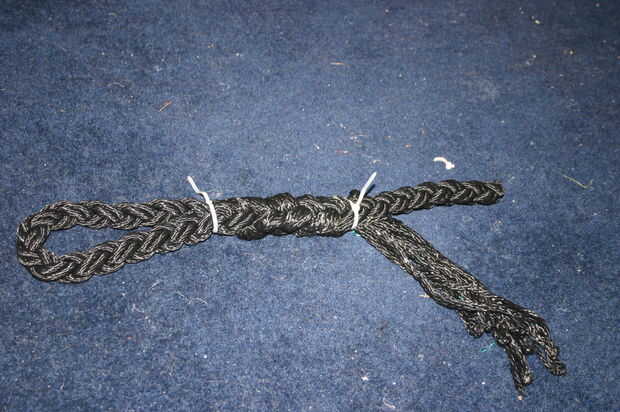 -Tomar dos hilos desde el extremo suelto y trabajarlas a través del orificio uno tras otro. Re la ampliación puede ser necesaria después de la primera hebra ha pasado a través. Si es necesario, meter la cabeza de la hebra a través con su pincho o marlinspike.