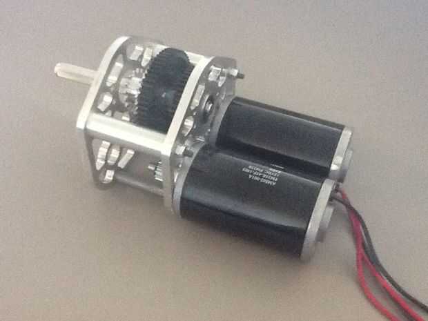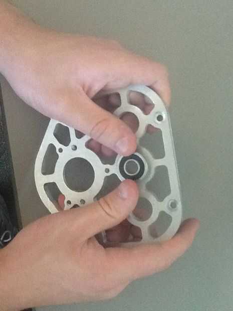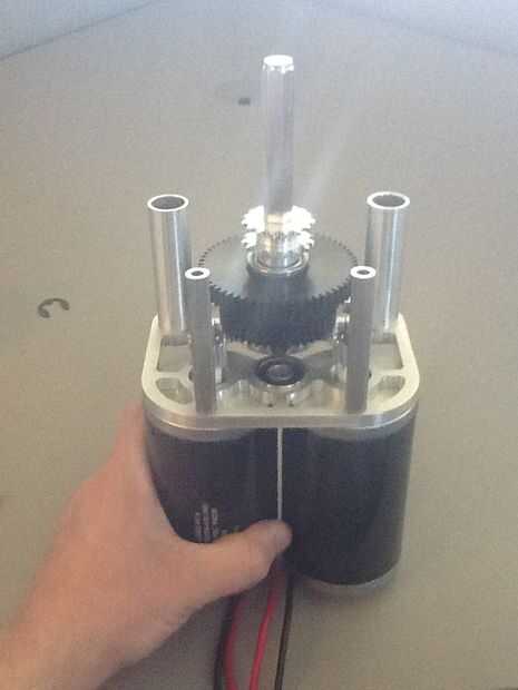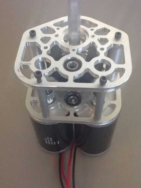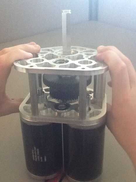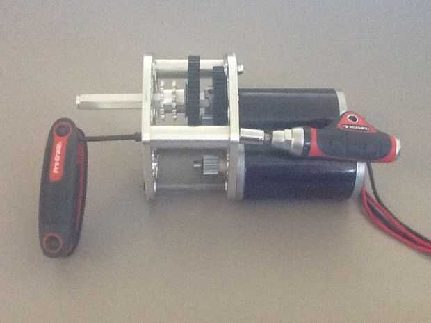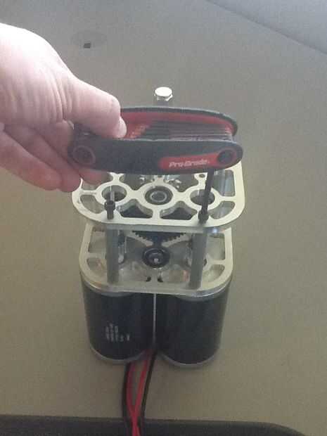En este paso, se reunirán el resto de la caja de engranajes. En primer lugar, presiona el final teniendo en el orificio superior central que se muestra en el primer cuadro 3/8". En los cuadros segundo y terceros, coloqué a los espaciadores de aluminio en sus agujeros en la placa primera y entonces alinea la segunda placa con los espaciadores. Las placas de la caja de engranajes tienen hombros para los espaciadores asegurar que las placas estén alineadas. Luego, me deslicé los cuatro tornillos de 3.5" 10-32 a través de los cuatro orificios que se muestra en la cuarta foto. En la quinta foto, utilicé una llave hexagonal de 5/32 para apretar los pernos que se atornillan en los motores. Entonces, utilicé una llave para instalar las tuercas nylock en los dos tornillos restantes. Esta configuración y su resultado se muestran en los cuadros VI y VII.