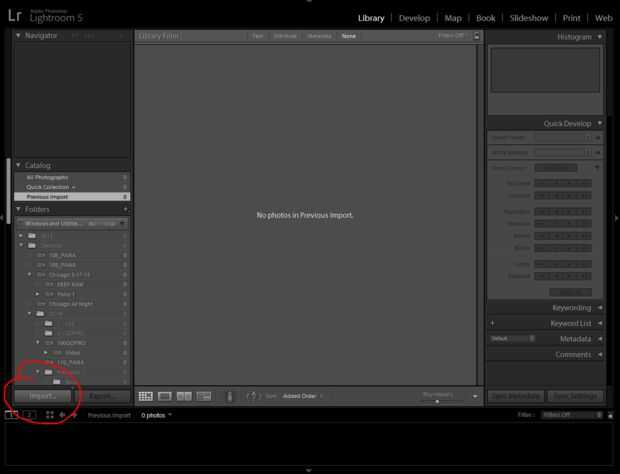 Vamos a importar algunas fotos. Asegúrese de que estás en la ficha biblioteca (arriba a la derecha de la pantalla) y luego "importar" (abajo a la izquierda).