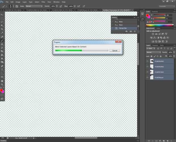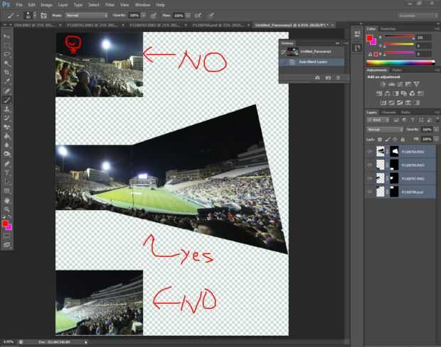 Nota: También puede probar diferentes combinaciones de fusiones para conseguir photoshop para ser más inteligente y hacer cosas combinar. Por ejemplo, si 1 + 2 + 3 + 4 no funciona y deja fuera a 1 y 4 como flotadores gratis, también puedes probar 2 + 3 + 4 para ver lo que sucedería. No bien conozco con Photomerge para saber qué combos.