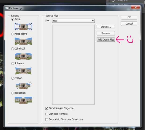 OK, no es gran cosa. ¡ Sólo golpe ok, cancelar de photomerge y guardarlos. Ahora sólo abrir Photomerge y golpear "Añadir archivos abiertos". Sólo debe seguir adelante y añadir todos los archivos abiertos sin problemas ahora.