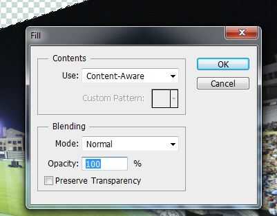 Ahora vaya a Edit -> Fill y asegúrese de que llena mediante la opción "Content Aware" luego presione ok (imagen 6).
