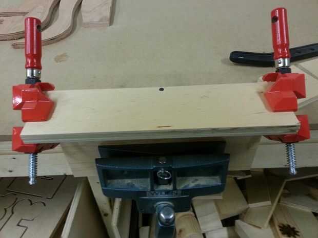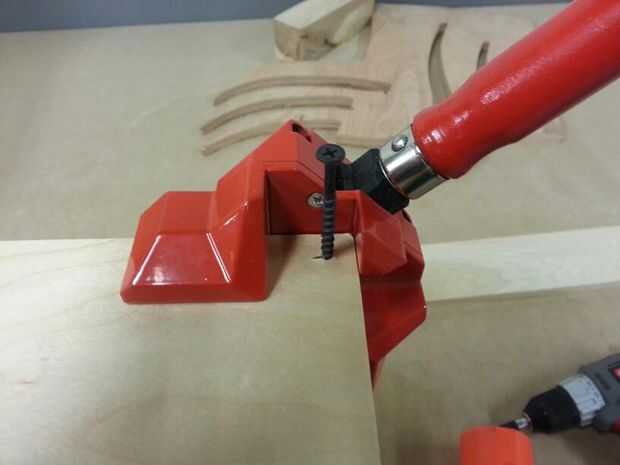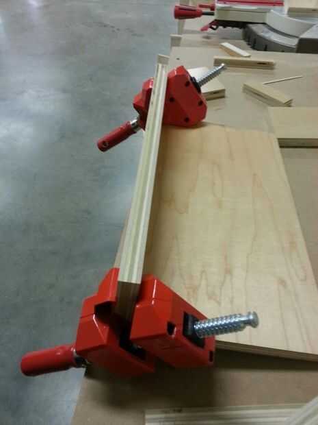 Así que aquí, que desea la esquina ambos extremos de uno de los lados largos a la parte inferior de la abrazadera. Asegúrese de que obtener todos los cuadrados de lados. Una vez que la parte inferior y el primer lado largo con abrazadera juntos, sujete el fondo en el tornillo de madera de modo que puede empezar a atornillar las dos piezas juntas.