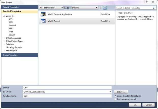 3. de las plantillas instaladas menú de la izquierda, seleccionar Visual C++ -> Win32. Ahora el centro debe mostrar el proyecto opciones de aplicación de consola Win32 y Win32.