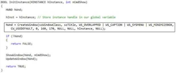 9. Desplácese hasta la función InitInstance() y localizar donde se llama a la función CreateWindow() . Esto es donde se crea la ventana principal y donde gran parte de su aspecto se determina. Los parámetros a editar son 3, 6 y 7.