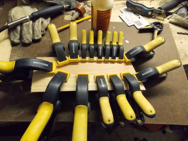Paso 5: Usando un buen pegamento de carpintero y un montón de pinzas (no se puede utilizar para muchas abrazaderas), alinee y pegue la pieza del centro a uno de su salida de piezas laterales.